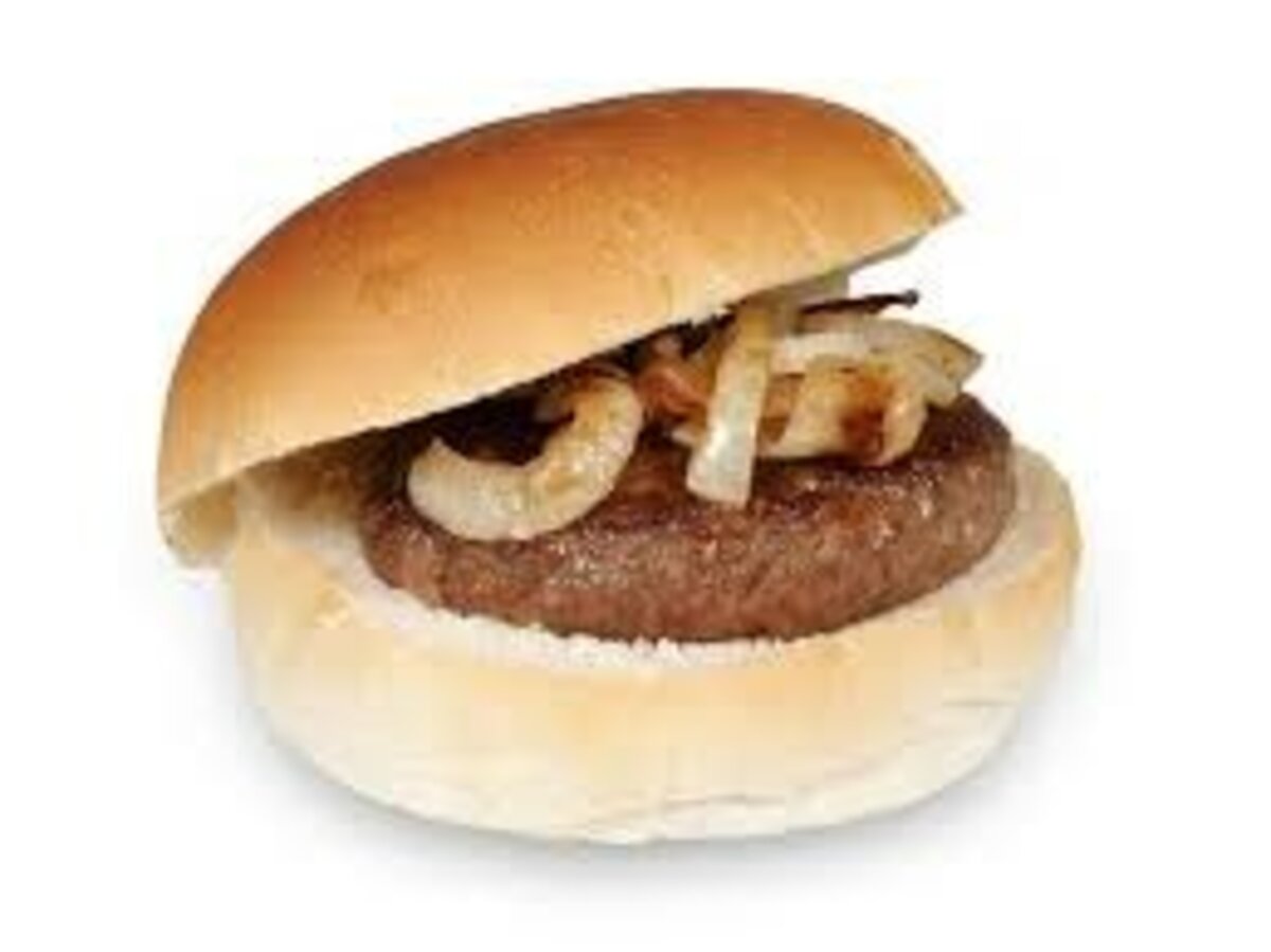 Vanmiddag geven we een hamburger tussen een broodje met verse ajuin en een sausje.