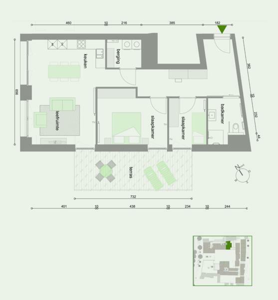 555.000 euro excl. servicekost (8,57 euro per dag per flat)