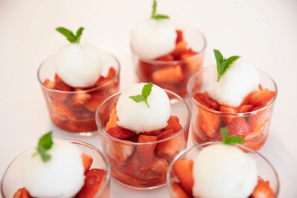 Geniet vandaag bij je menu van een lekker dessertje met aardbei: Crème van citroen, verse aardbeien en witte chocolade.