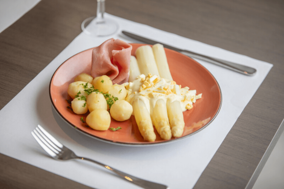 Tijdens het middagmenu van 21 mei voor zien we heerlijke verse asperges à la flamande met krieltjes en bieslook