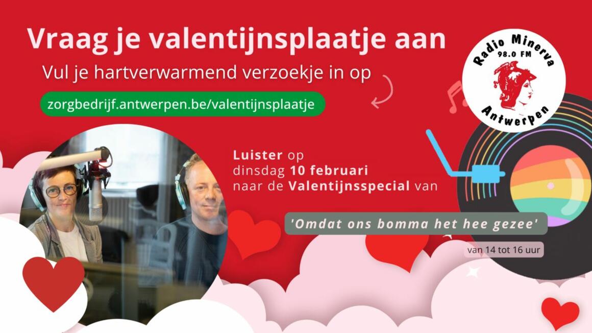 Dinsdag 11 februari kan je luisteren naar de Valentijnsspecial van het radioprogramma 'Omdat ons bomma het hee gezee' op Radio Minerva. Presentatoren en Zorgbedrijfcollega's Steven en Kathleen draaien dan graag liefdevolle verzoekjes.