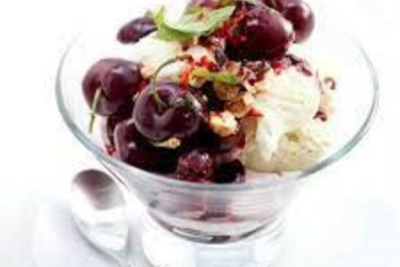 Een coupe vanille ijs met warme krieken en een toefje slagroom.