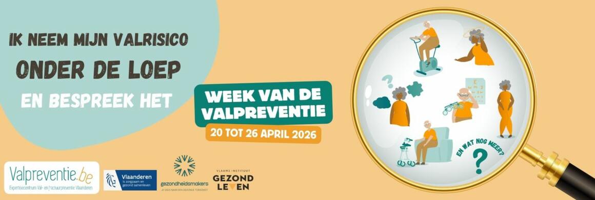 Een val is zelden toeval. Vaak spelen meerdere oorzaken een rol, zoals evenwichtsproblemen, verminderd zicht en/of spierkracht, medicatie, schoeisel, obstakels in je woonomgeving. Van 20 tot 26 april organiseert het Expertisecentrum Val- en fractuurpreventie Vlaanderen in samenwerking met de Gezondheidsmakers en het Vlaams Instituut Gezond Leven, de Week van de Valpreventie. Het doel is om ouderen, hun familie en alle gezondheidszorg- en welzijnswerkers in Vlaanderen te sensibiliseren over val- en fractuurpreventie.