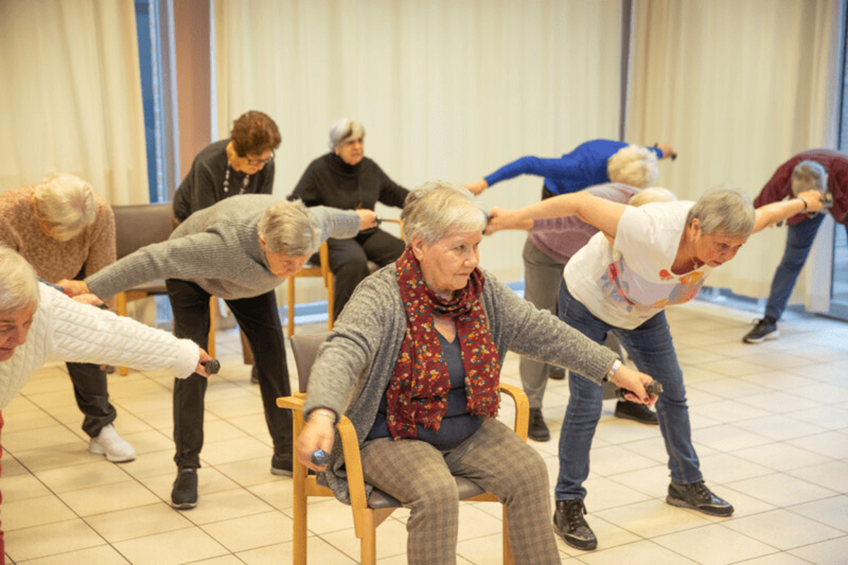 De oefeningen worden aangepast aan ieders niveau, zodat iedereen kan meedoen op zijn of haar eigen tempo.