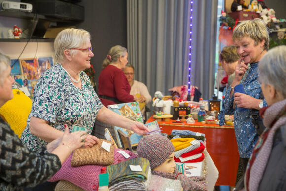 Cadeau marktje met verschillende verkoopstandjes en lekkere appelbeignets