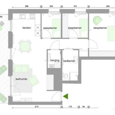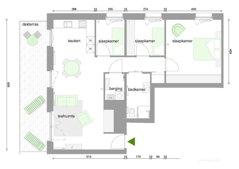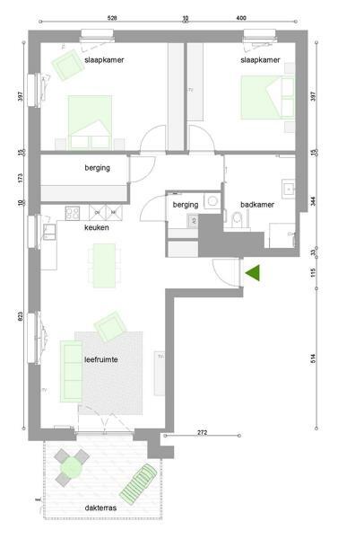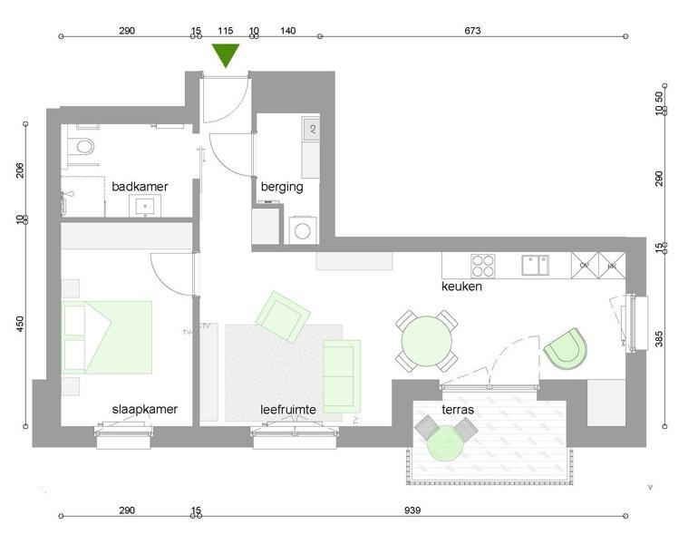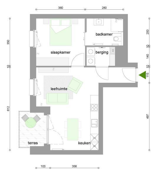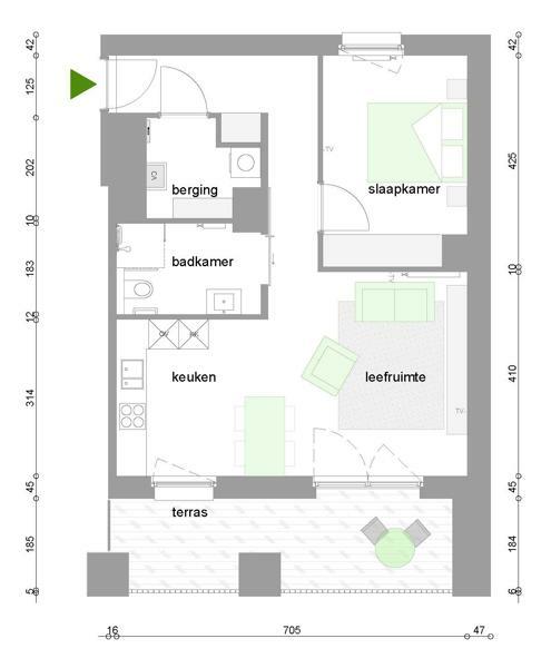 • De ingang van het gebouw ligt aan de binnentuin. Er is een lift en een trap. De inkomhal van de flats is apart, naast de toegang tot het dienstencentrum op het gelijkvloers.