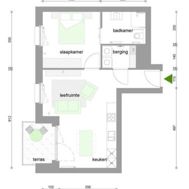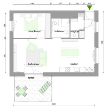 Assistentiewoning met 1 slaapkamer en terras op eerste verdieping.