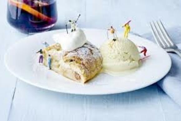 Onze smul vandaag is Appelstrüdel, ijs, slagroom + topping
