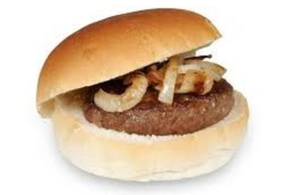 Vanmiddag geven we een hamburger tussen een broodje met verse ajuin en een sausje.