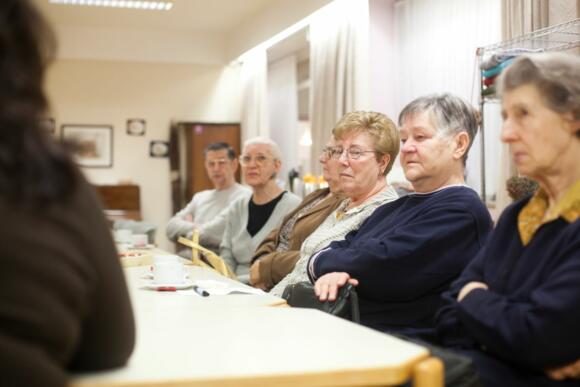 De buurtzorgcoördinator nodigt de vaste vrijwilligers van het dienstencentrum uit voor een bespreking van de taken die ze uitvoeren en de hulp die Liberty kan gebruiken.