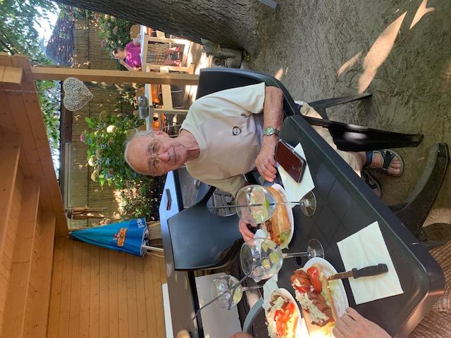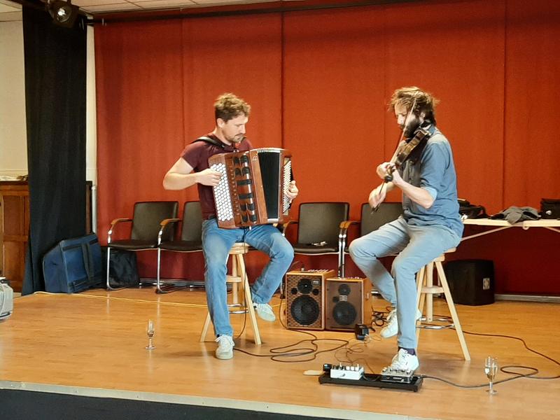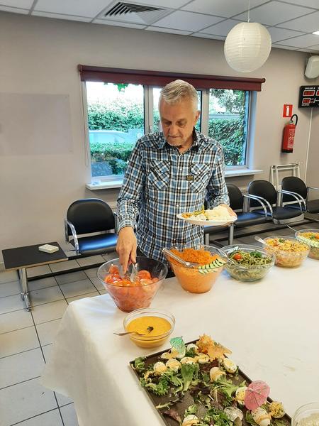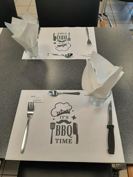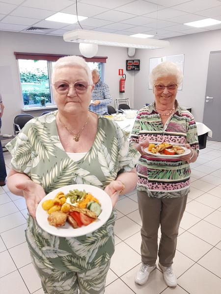 Karolien: ‘Onze kok van dienst stond met zijn barbecuetruck in de file, zodat onze honger even op de proef werd gesteld. En geloof het of niet – in deze hete zomer – het regende! Zodat we onze tafels binnen moesten dekken. Maar eerlijk? Dat heeft de pret niet kunnen drukken, onze goesting in gegrilde worstjes, satés en ribbekes was alleen maar groter! En met die lekkere bijgerechten en koude groenten was het een echt feestmaal, waar alle aanwezigen van gesmuld hebben! Neem daarbij nog de muzikale omlijsting van ‘Amoerfoe’, een artiestenduo met viool en accordeon, en het plaatje was compleet.