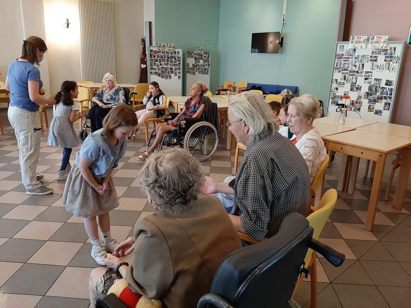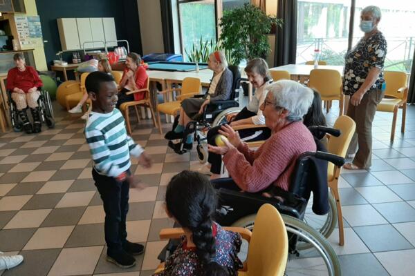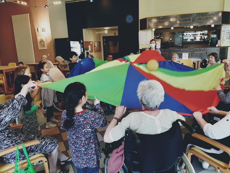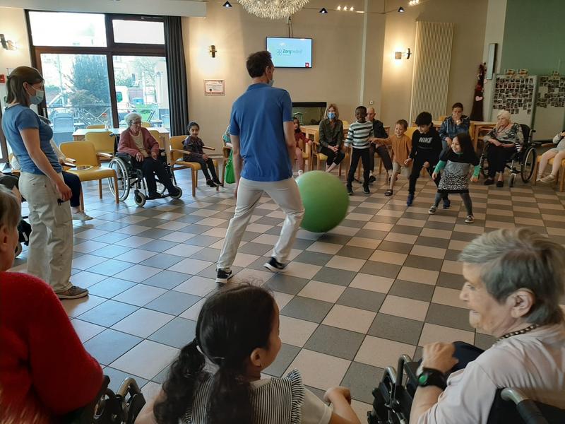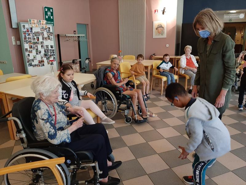 Martina, hoofdverpleegkundige van woonzorgcentrum Vinck-Heymans in Antwerpen: "De oudste kleuters van basischool De Zonnebloem zijn komen sporten met onze bewoners. Samen deden ze heel wat bewegingsoefeningen zoals turnoefeningen. We deden ook baloefeningen waarbij de bewoners proberen kinderen te raken, heel leuk. We eindigden met de parachute en hockey. We doen dit vaker, bijna maandelijks komen kinderen uit de naburige school langs. Ook lagereschoolkinderen, die komen dan voorlezen, gezelschapsspelletjes en volksspelen spelen, fruitsalade maken, liedjes zingen ... Iedereen is superenthousiast. Ouderen komen speciaal naar deze activiteit, ze kijken er echt naar uit."