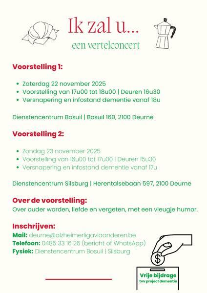Zaterdag 22 en zondag 23 november organiseert de Familiegroep Dementie regio Deurne i.s.m. de Alzheimer Liga Vlaanderen en district Deurne het verteltoneel 'Ik zal u ...' in dienstencentra Bosuil en Silsburg. De voorstelling is gebaseerd op een tekst van Toon Tellegen. Je betaalt ter plaatse een vrije bijdrage, maar moet wel vooraf reserveren.