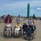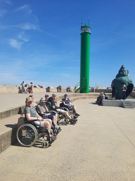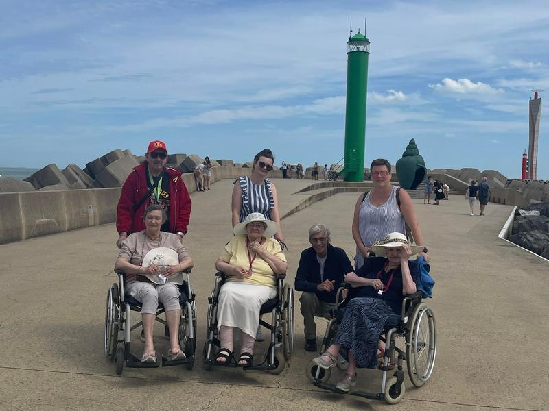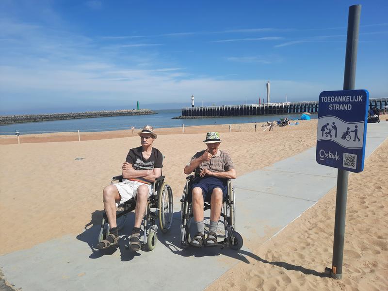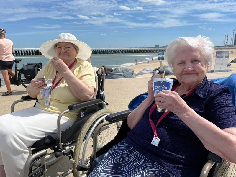 Maar ook uitstapjes naar zee vormen een vaste traditie. Elke week nemen we met een wisselend bewonersgroepje de kusttrein, de hele zomer lang, zodat iedereen aan bod komt. Dat verloopt erg vlot, want Oostende is een heel rolstoelvriendelijke badstad. Er is zelfs een speciale strook voorzien om met de rolstoel het strand op te rijden. Natuurlijk krijgen Steffi en ik bij al deze activiteiten ondersteuning van heel het team, zoals onze ergo- en kinecollega’s.”