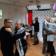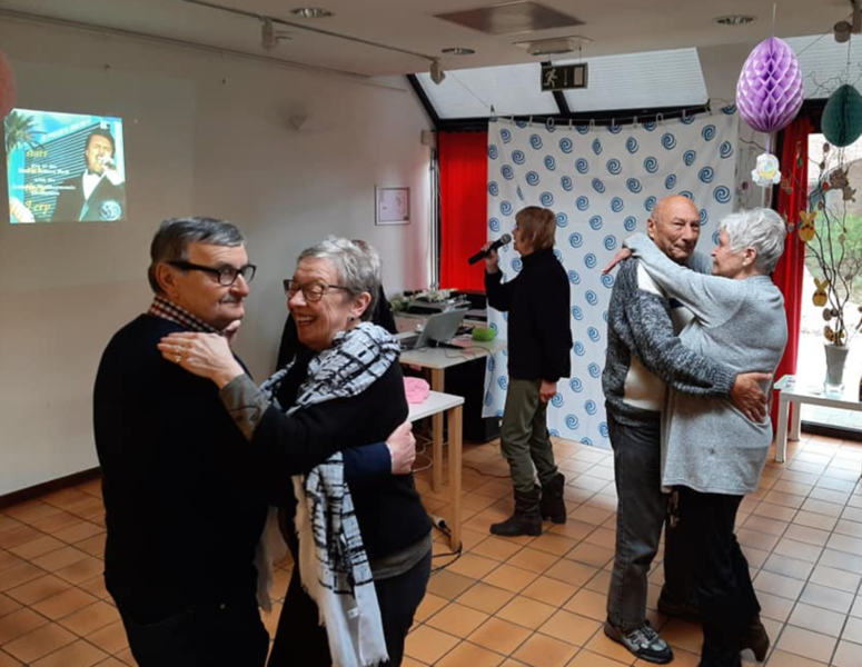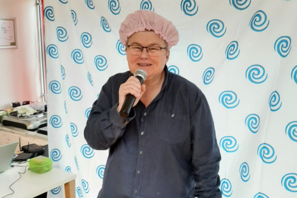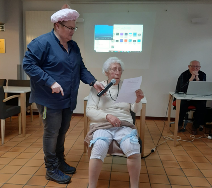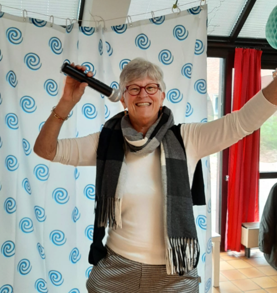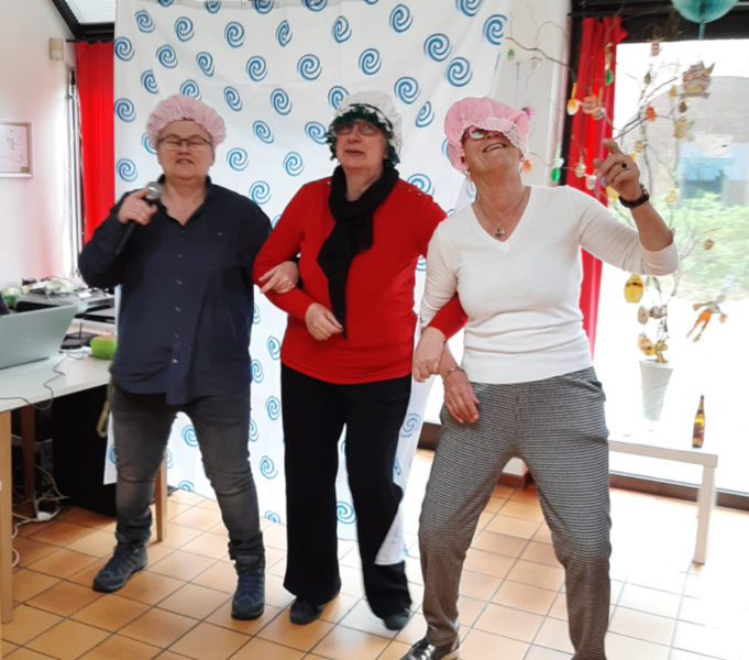 Nancy, medewerker van dienstencentrum Arena (Deurne): "We vroegen ons af: 'wanneer durven mensen zingen?'. Wel, in de douche. Of dat nu vals is of toonvast, maakt niet uit. Dat inzicht was de inspiratie voor deze karaoke- en dansactiviteit. Toen we die aankondigden dachten mensen dat het een aprilgrap was. Want deze geestige namiddag stond gepland op 1 april. Maar toen de mensen ons 's morgens het decor met het douchegordijn zagen bouwen en de douchemutsen zagen klaarleggen, zagen ze dat het echt zou doorgaan. Swa, een vrijwilliger die muzikale activiteiten ook bij Silsburg begeleidt, zorgde voor enkele sfeervolle zanguurtjes!"